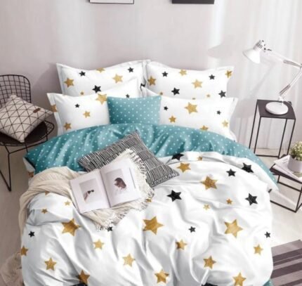 Prețul inițial a fost: 109,00 lei.85,00 leiPrețul curent este: 85,00 lei.Lenjerie Bumbac Satinat, 4 Piese, cu 2 fețe, Pat Dublu, Alb, Stele