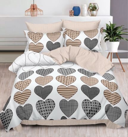 Lenjerie Bumbac Finet, Cearceaf cu Elastic, 6 Piese, Pat Dublu, Clasic, Bej, Inimioare
