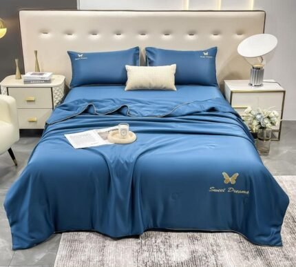 Prețul inițial a fost: 199,00 lei.139,00 leiPrețul curent este: 139,00 lei.Lenjerie de pat din Mătase, Pilotă Inclusă, Cearceaf Clasic, 4 Piese, Pat Dublu, Bleumarin