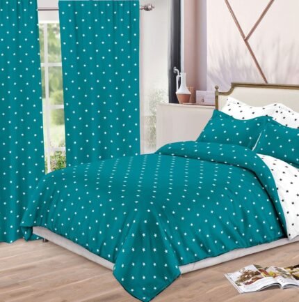 Prețul inițial a fost: 199,00 lei.159,00 leiPrețul curent este: 159,00 lei.Lenjerie Bumbac Finet, Pat Dublu, 8 Piese, 2 Draperii Incluse, Alb, Turcoaz, Stele
