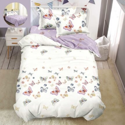 Prețul inițial a fost: 119,00 lei.89,00 leiPrețul curent este: 89,00 lei.Lenjerie Bumbac Finet, Cearceaf Clasic, 4 Piese, Pat 1 Persoană, Lila, Fluturi