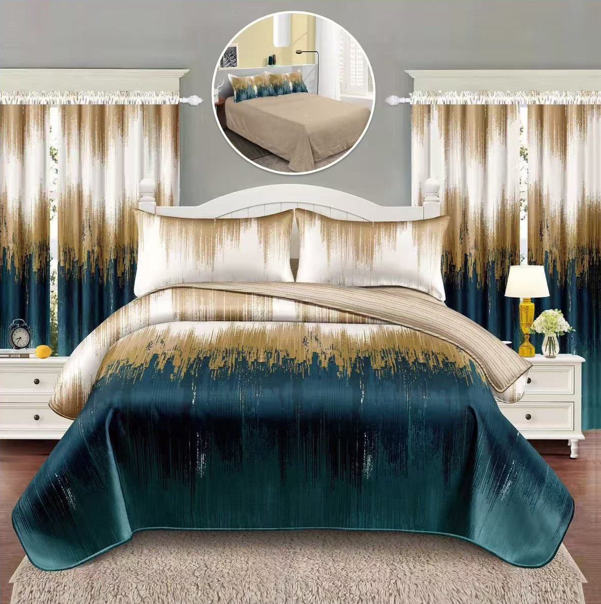 Lenjerie Bumbac Finet, Cearceaf Clasic, Pat 1 Persoană, 2 Draperii Incluse, Verde-Albăstrui, Bej