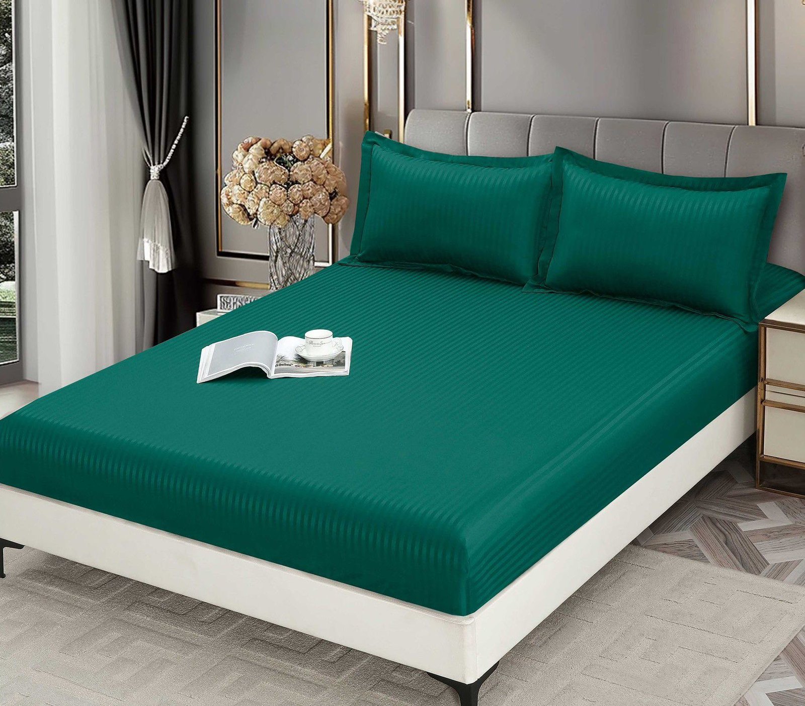 Cearceaf cu Elastic 180x200cm, Damasc Finetat, 2 fețe de pernă, 50×70 cm, Verde Închis