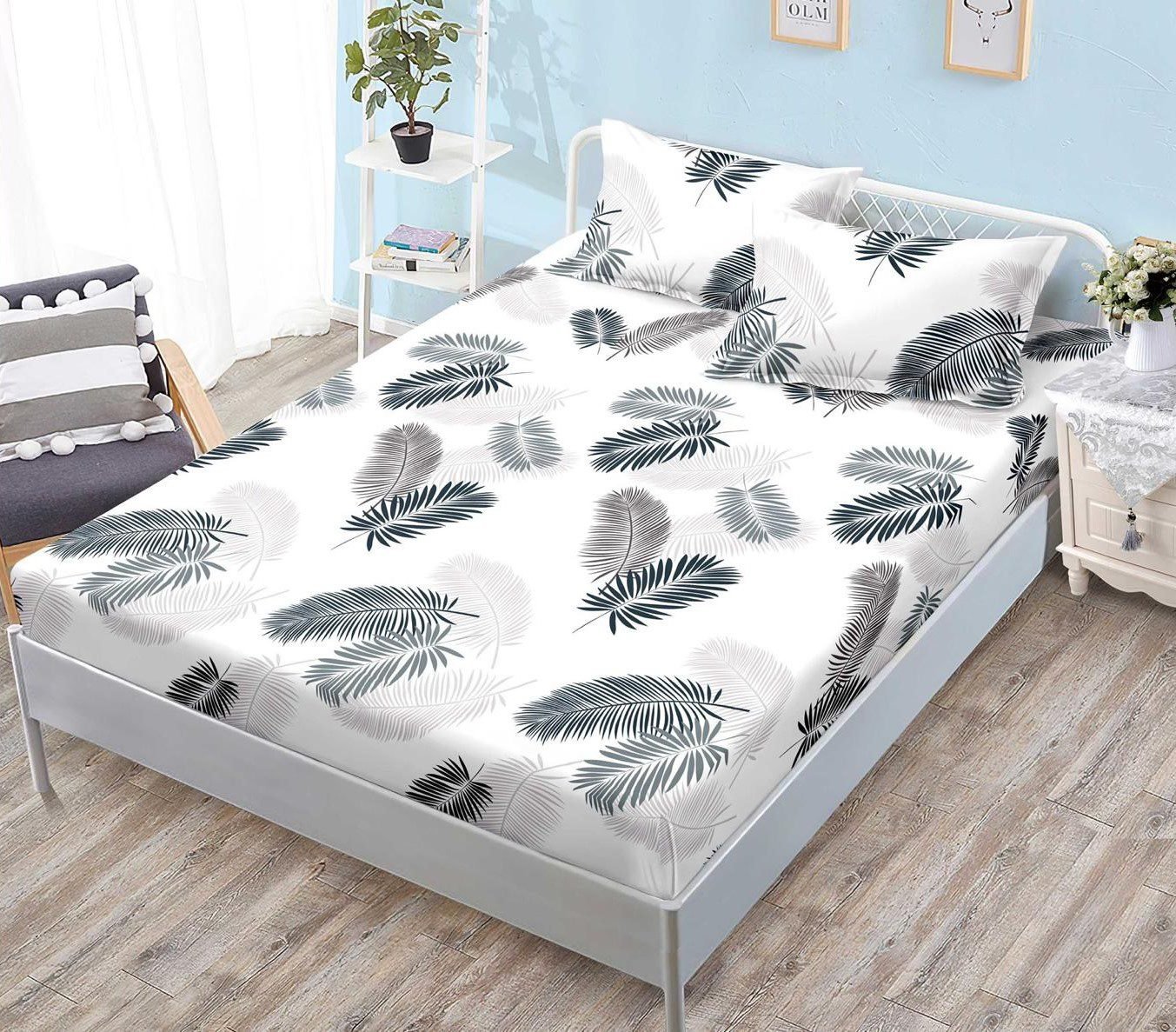 Husă de pat cu Elastic, Bumbac Satinat, 2 Fețe de Pernă, 180×200 cm, Alb, Frunze