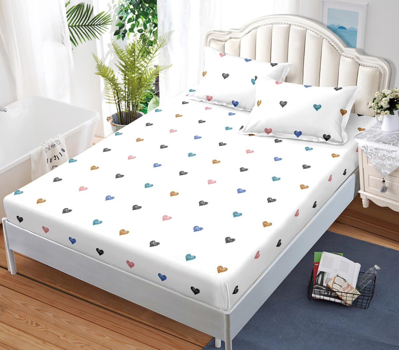 Husă de pat cu Elastic, Bumbac Satinat, 2 Fețe de Pernă, 180×200 cm, Alb, Inimioare