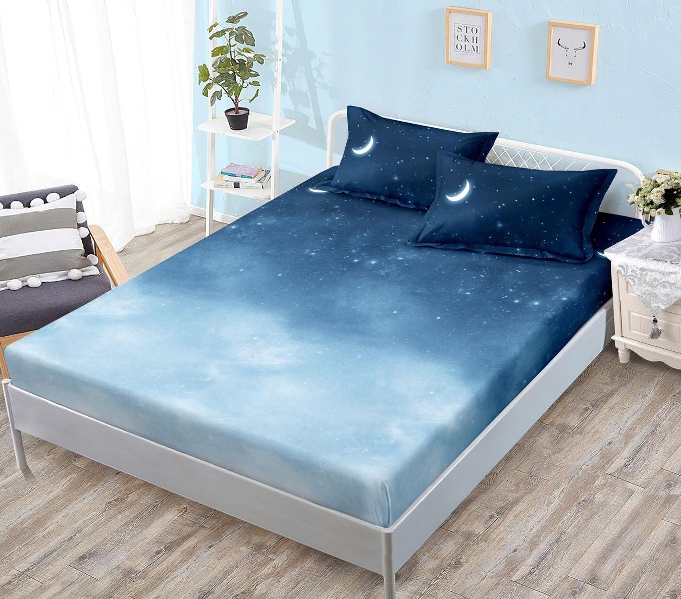 Husă de pat cu Elastic, Bumbac Satinat, 2 Fețe de Pernă, 180×200 cm, Albastru Degrade, Stele