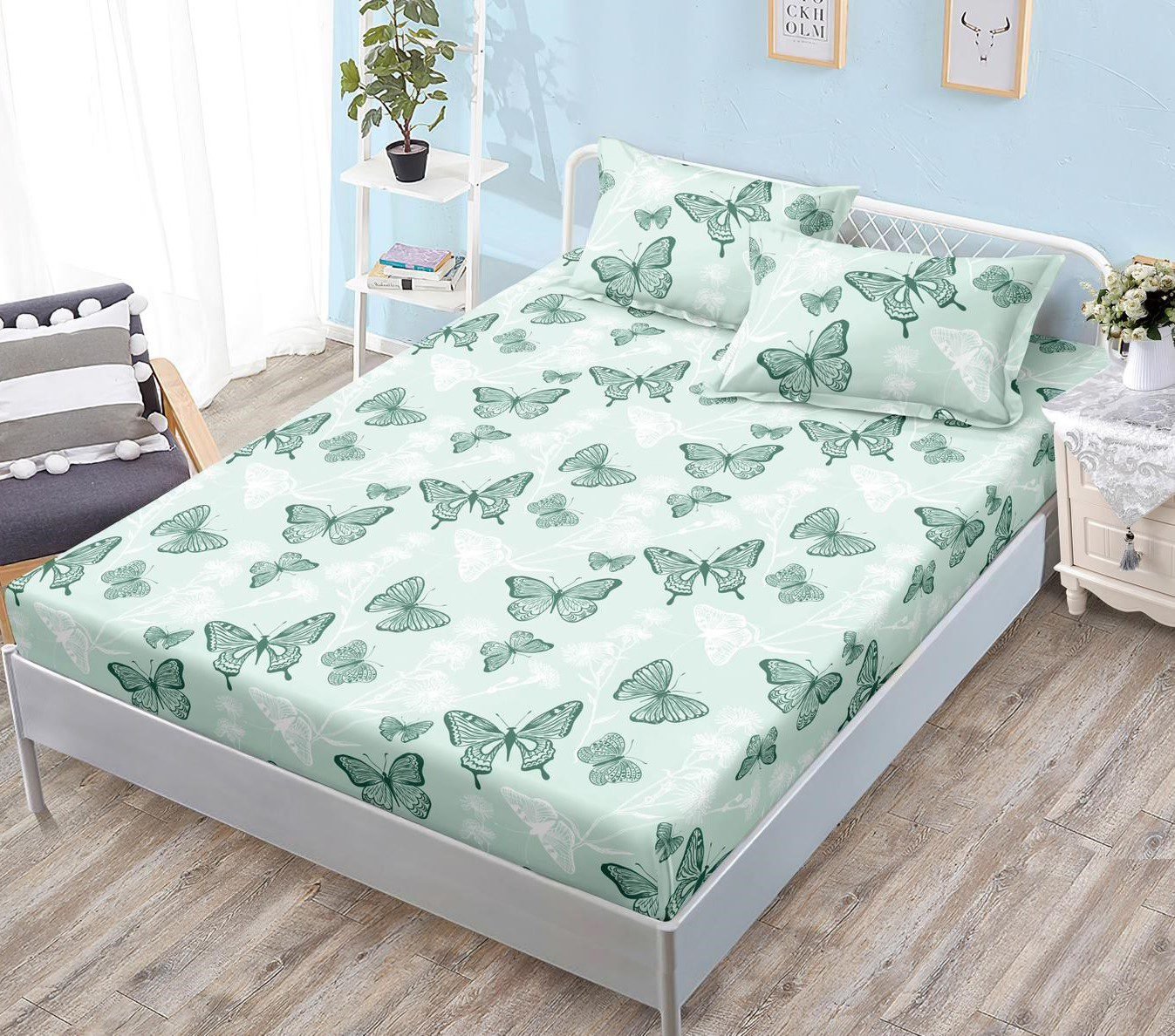 Husă de pat cu Elastic, Bumbac Satinat, 2 Fețe de Pernă, 180×200 cm, Verde, Fluturi
