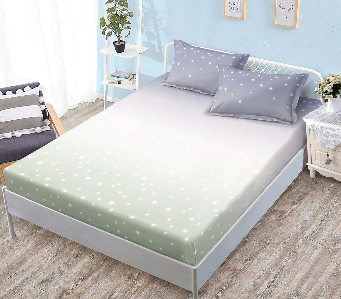 Husă de pat cu Elastic, Bumbac Satinat, 2 Fețe de Pernă, 180×200 cm, Degrade, Stele