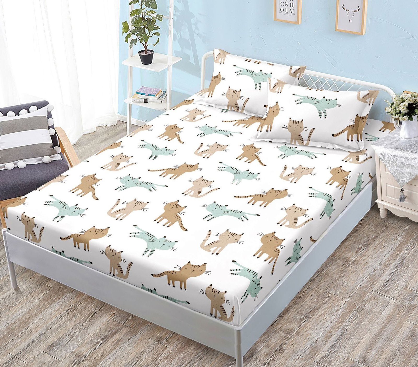 Husă de pat cu Elastic, Bumbac Satinat, 2 Fețe de Pernă, 180×200 cm, Alb, Pisicuțe