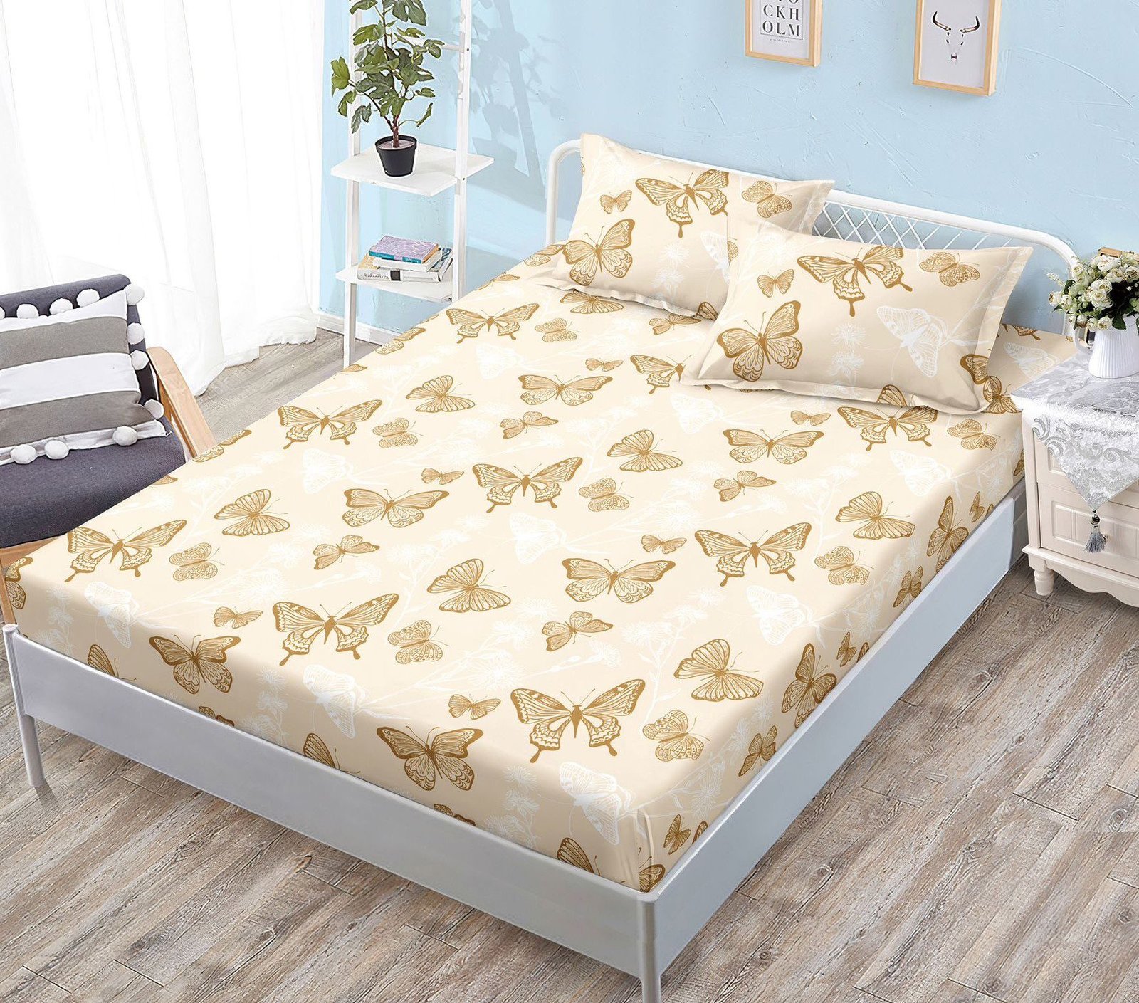 Husă de pat cu Elastic, Bumbac Satinat, 2 Fețe de Pernă, 180×200 cm, Crem, Fluturi