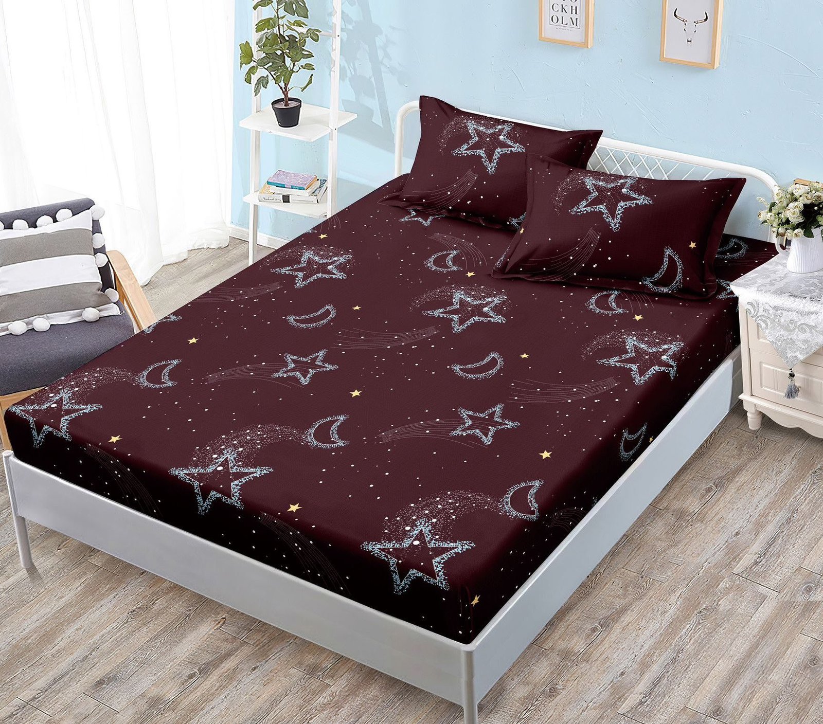 Husă de pat cu Elastic, Bumbac Satinat, 2 Fețe de Pernă, 180×200 cm, Grena, Stele