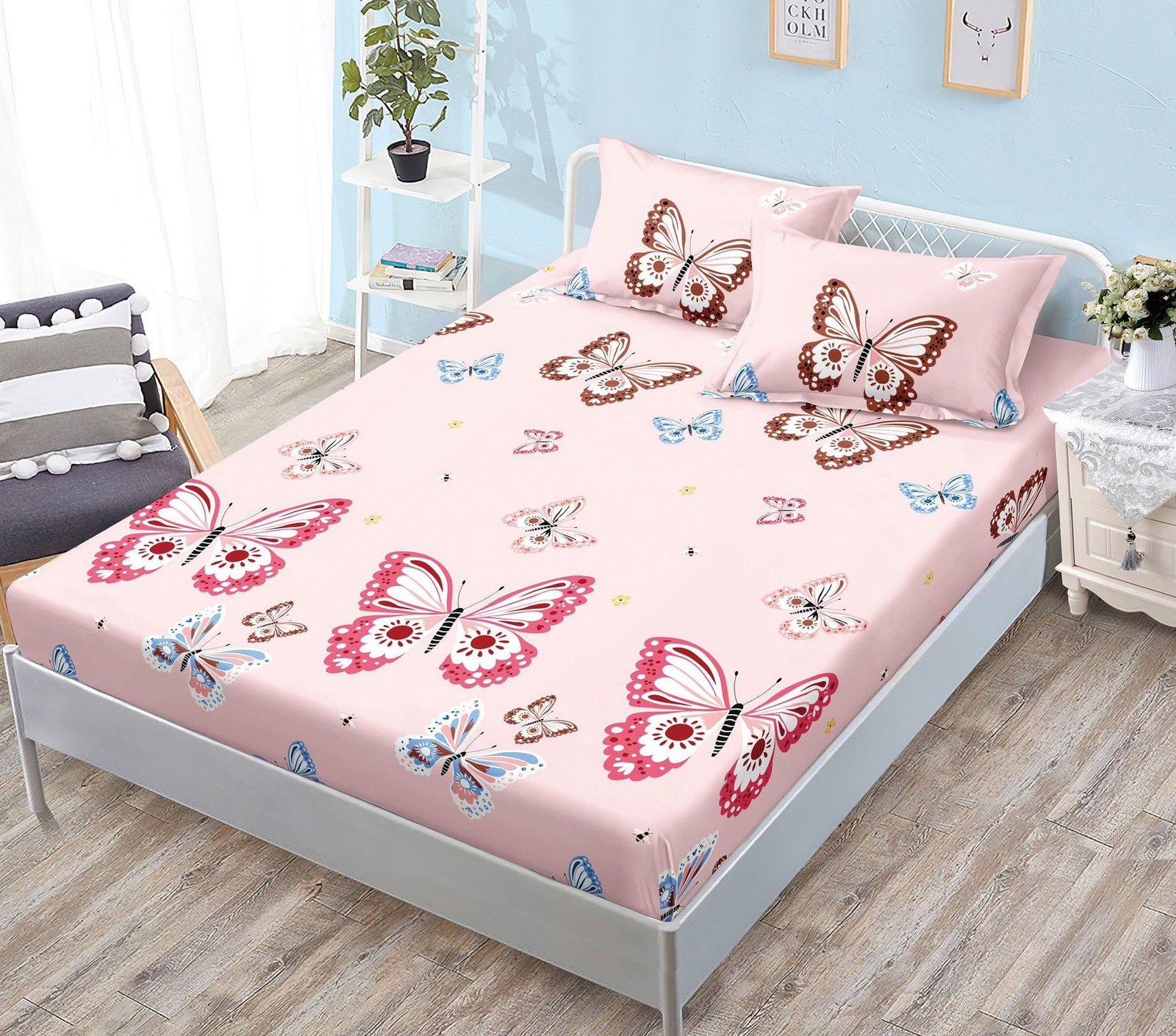 Husă de pat cu Elastic, Bumbac Satinat, 2 Fețe de Pernă, 180×200 cm, Roz, Fluturi