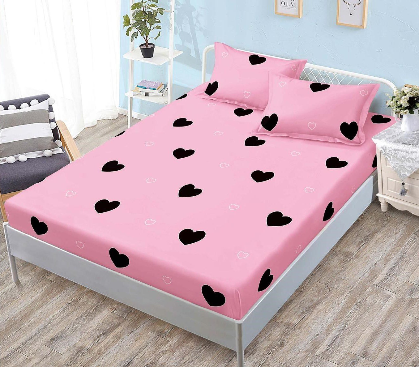 Husă de pat cu Elastic, Bumbac Satinat, 2 Fețe de Pernă, 180×200 cm, Roz, Inimioare