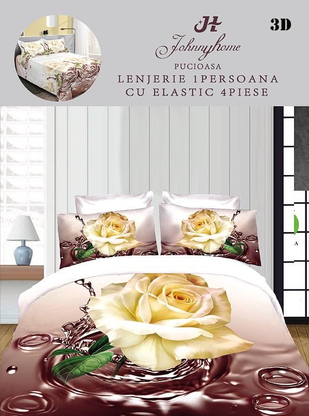Lenjerie 3D, Bumbac Satinat, 4 piese, Pat 1 Persoană, Trandafiri, Maro