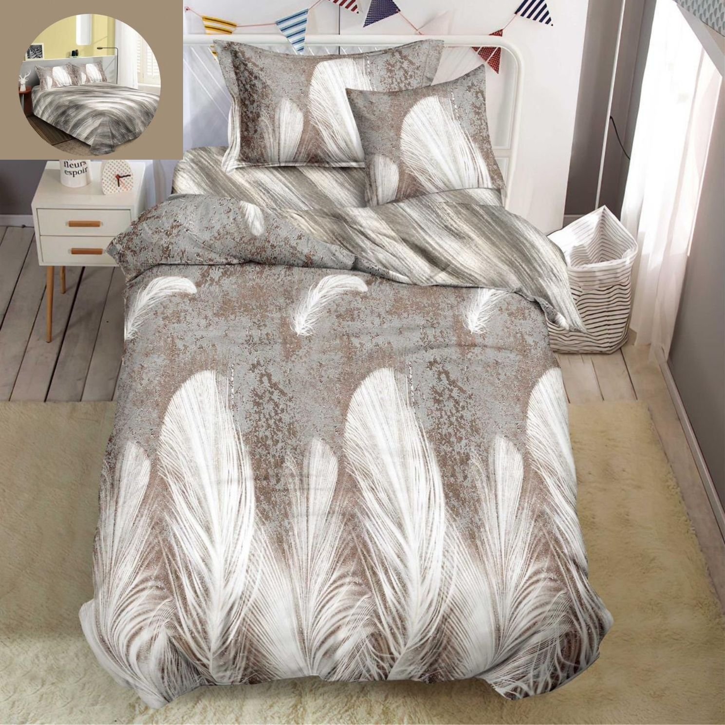 Lenjerie Bumbac Finet, Cearceaf Clasic, 4 Piese, Pat 1 Persoană, Bej, Pene