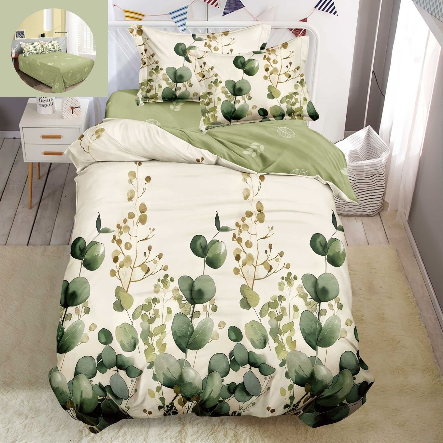 Lenjerie Bumbac Finet, Cearceaf Clasic, 4 Piese, Pat 1 Persoană, Crem, Verde, Flori