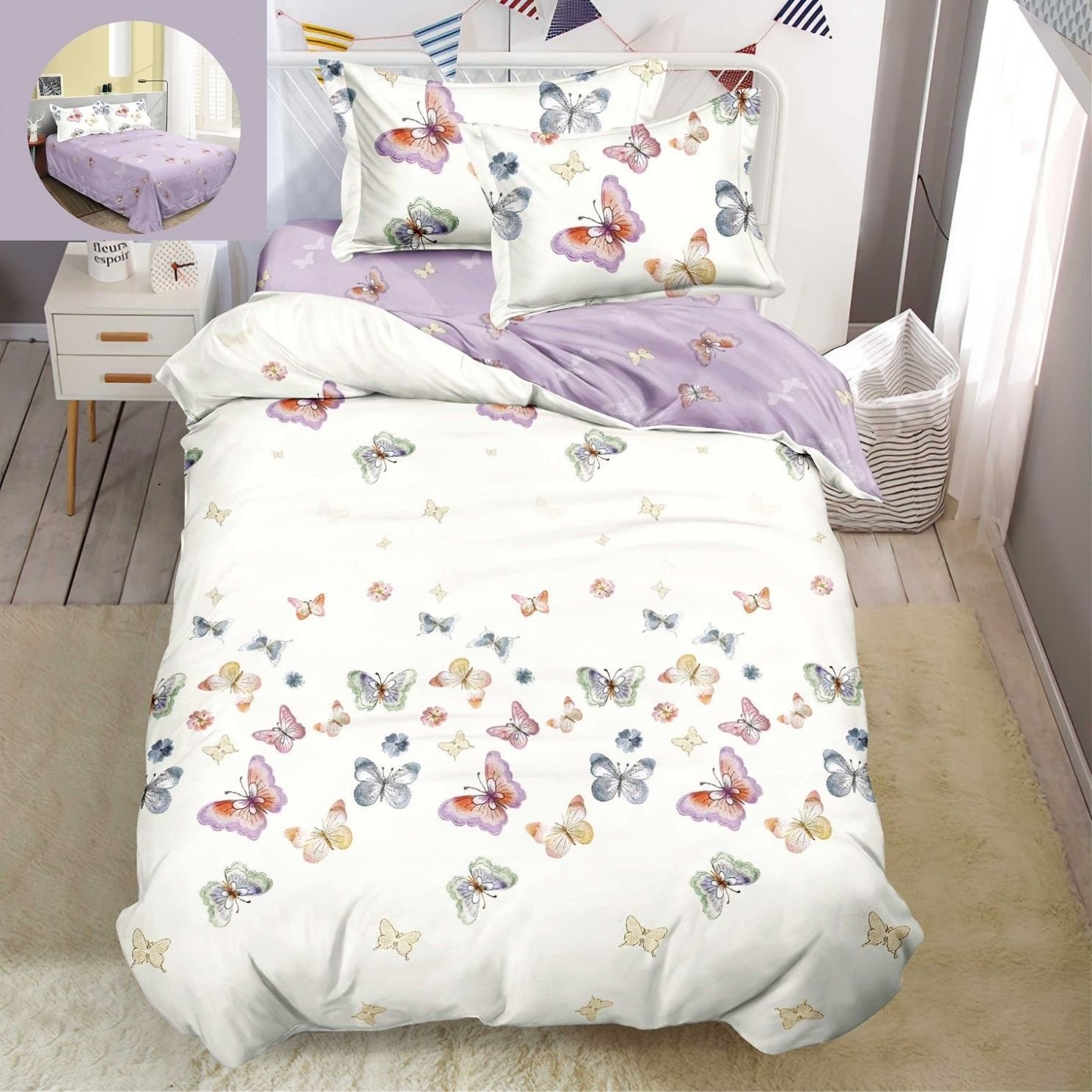 Lenjerie Bumbac Finet, Cearceaf Clasic, 4 Piese, Pat 1 Persoană, Lila, Fluturi