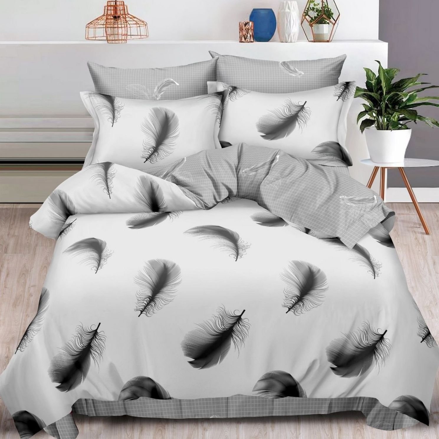 Lenjerie Bumbac Finet, Cearceaf Clasic, 6 Piese, Pat Dublu, Clasic, Gri, Pene