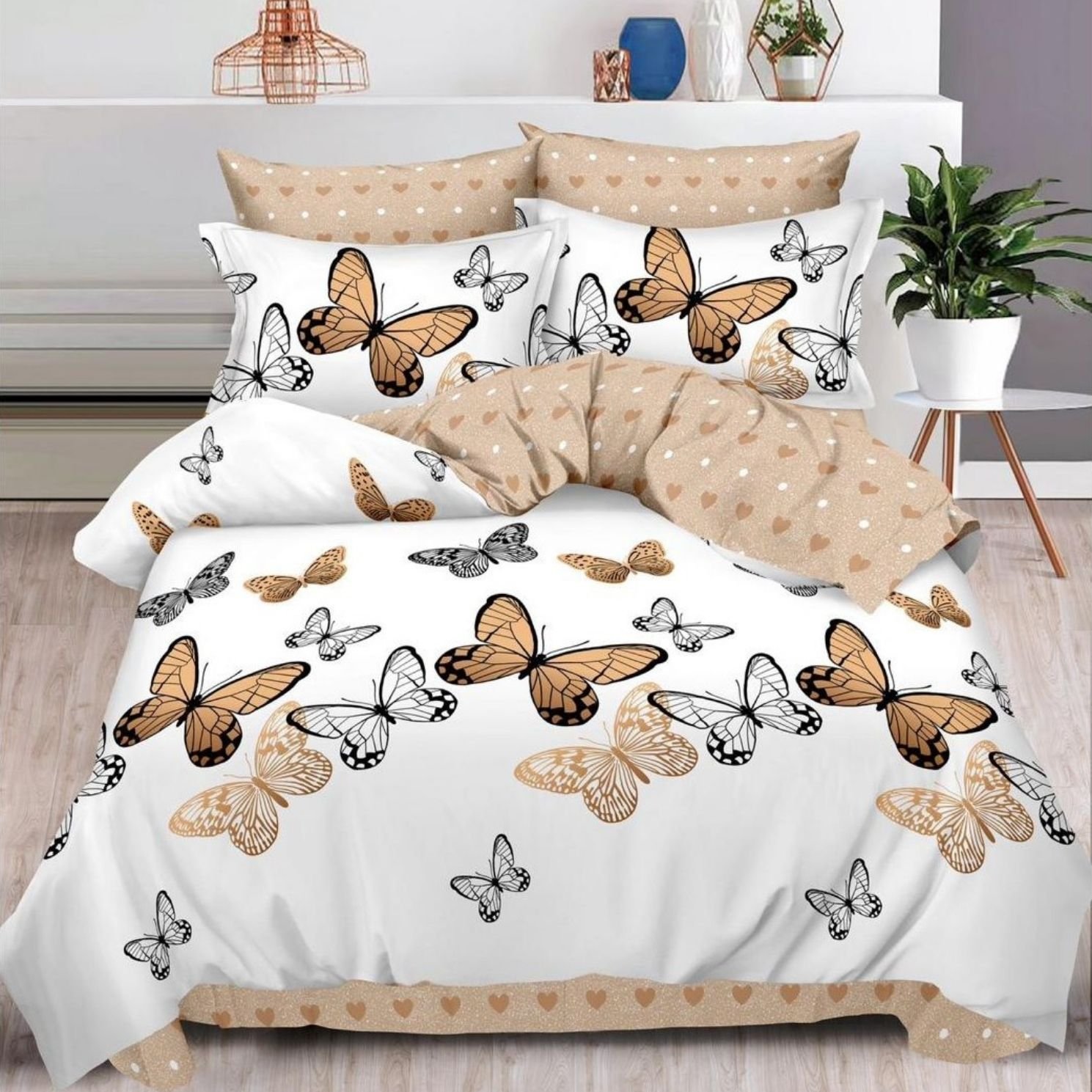 Lenjerie Bumbac Finet, Cearceaf Clasic, 6 Piese, Pat Dublu, Alb, Bej, Fluturi