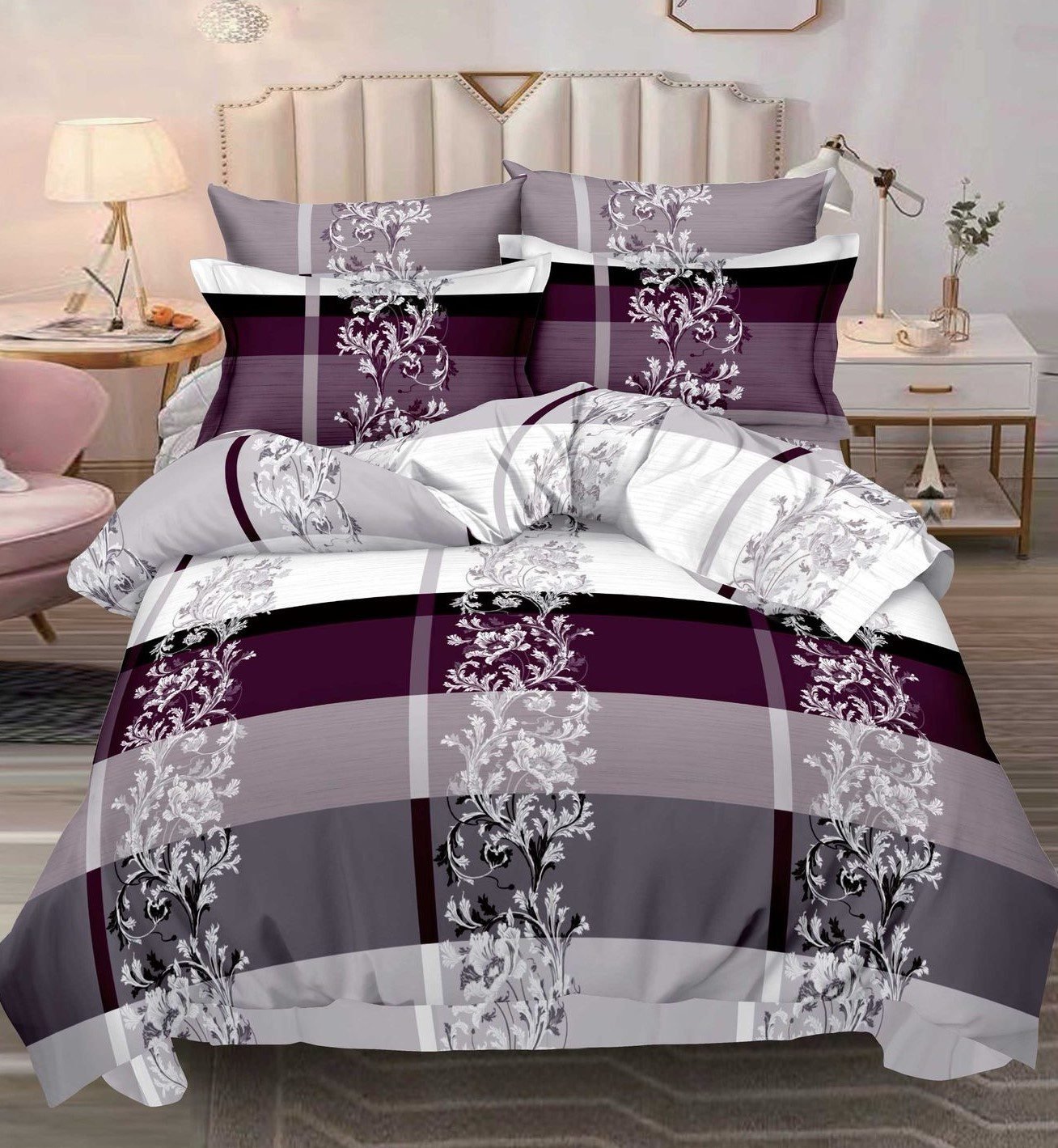 Lenjerie Bumbac Finet, Cearceaf Clasic, 6 Piese, Pat Dublu, Clasic, Mov, Floral