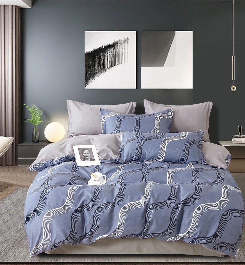 Lenjerie Bumbac Finet, Cearceaf Clasic, 6 Piese, Pat Dublu, Clasic, Albastru, Gri, Valuri