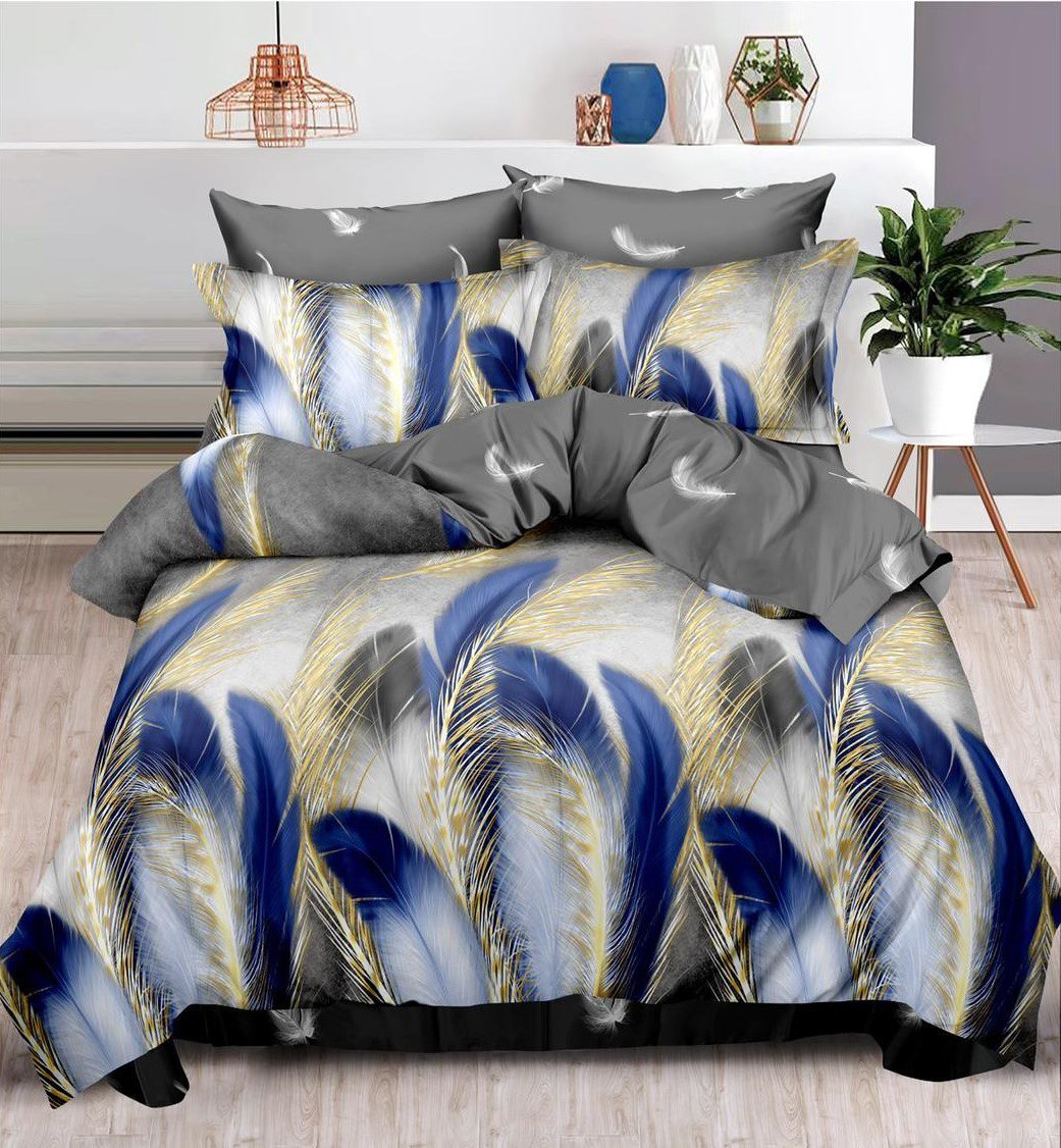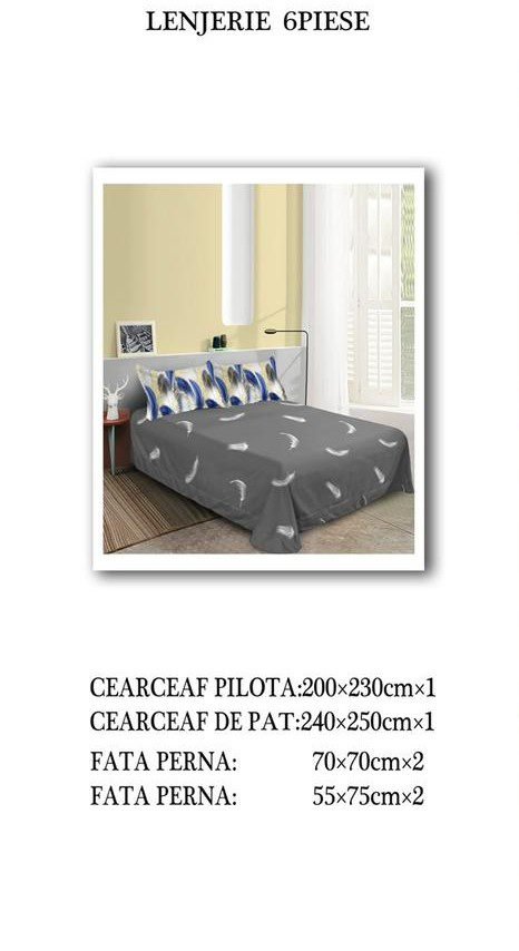 Lenjerie Bumbac Finet, Cearceaf Clasic, 6 Piese, Pat Dublu, Gri, Albastru, Pene