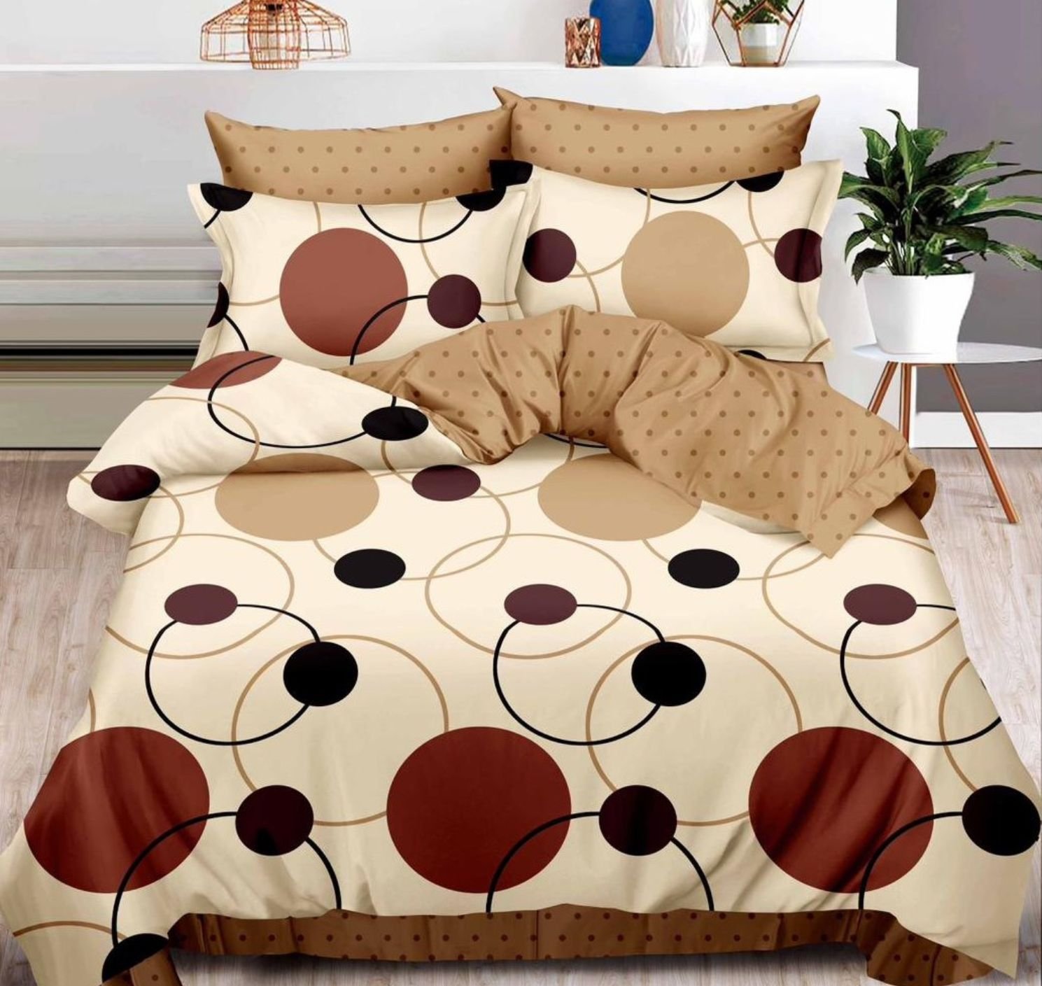 Lenjerie Bumbac Finet, Cearceaf Clasic, 6 Piese, Pat Dublu, Bej, Maro, Cercuri