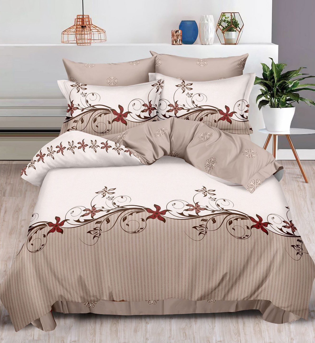Lenjerie Bumbac Finet, Cearceaf Clasic, 6 Piese, Pat Dublu, Clasic, Bej, Flori
