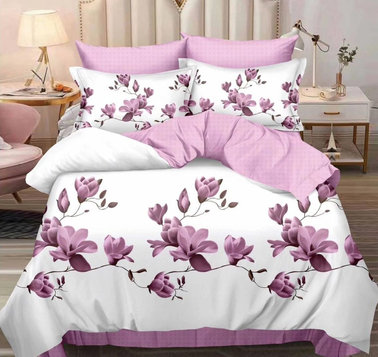 Lenjerie Bumbac Finet, Cearceaf Clasic, 6 Piese, Pat Dublu, Alb, Roz, Flori