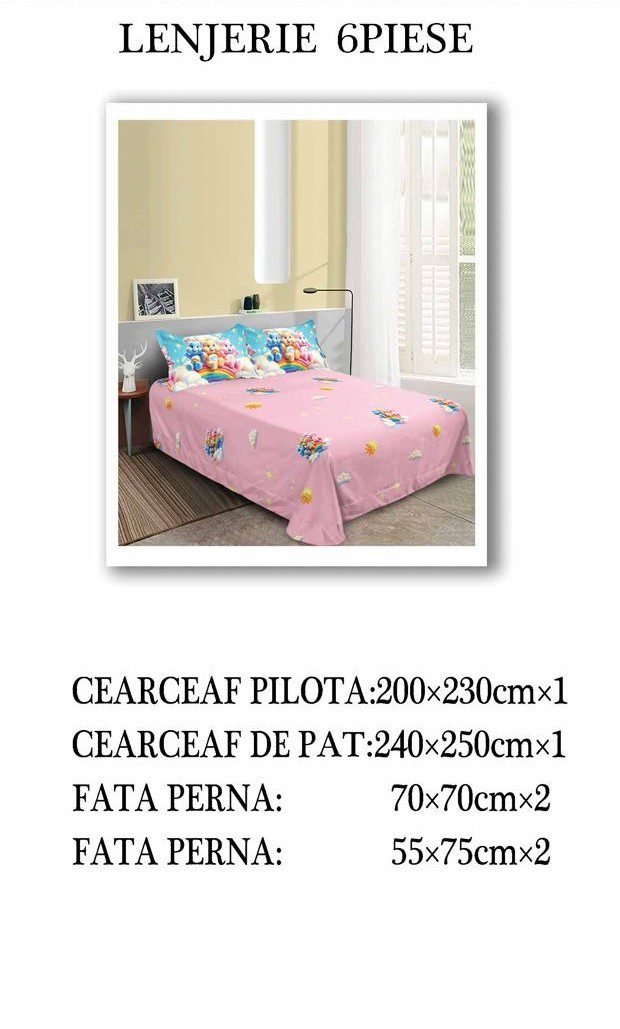 Lenjerie Bumbac Finet, Cearceaf Clasic, 6 Piese, Pat Dublu, Clasic, Roz, Bleu, Ursuleți