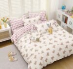 Lenjerie Bumbac Satinat, Cearceaf cu Elastic, 4 Piese, cu 2 fețe, Pat Dublu, Crem, Roz, Ursuleți
