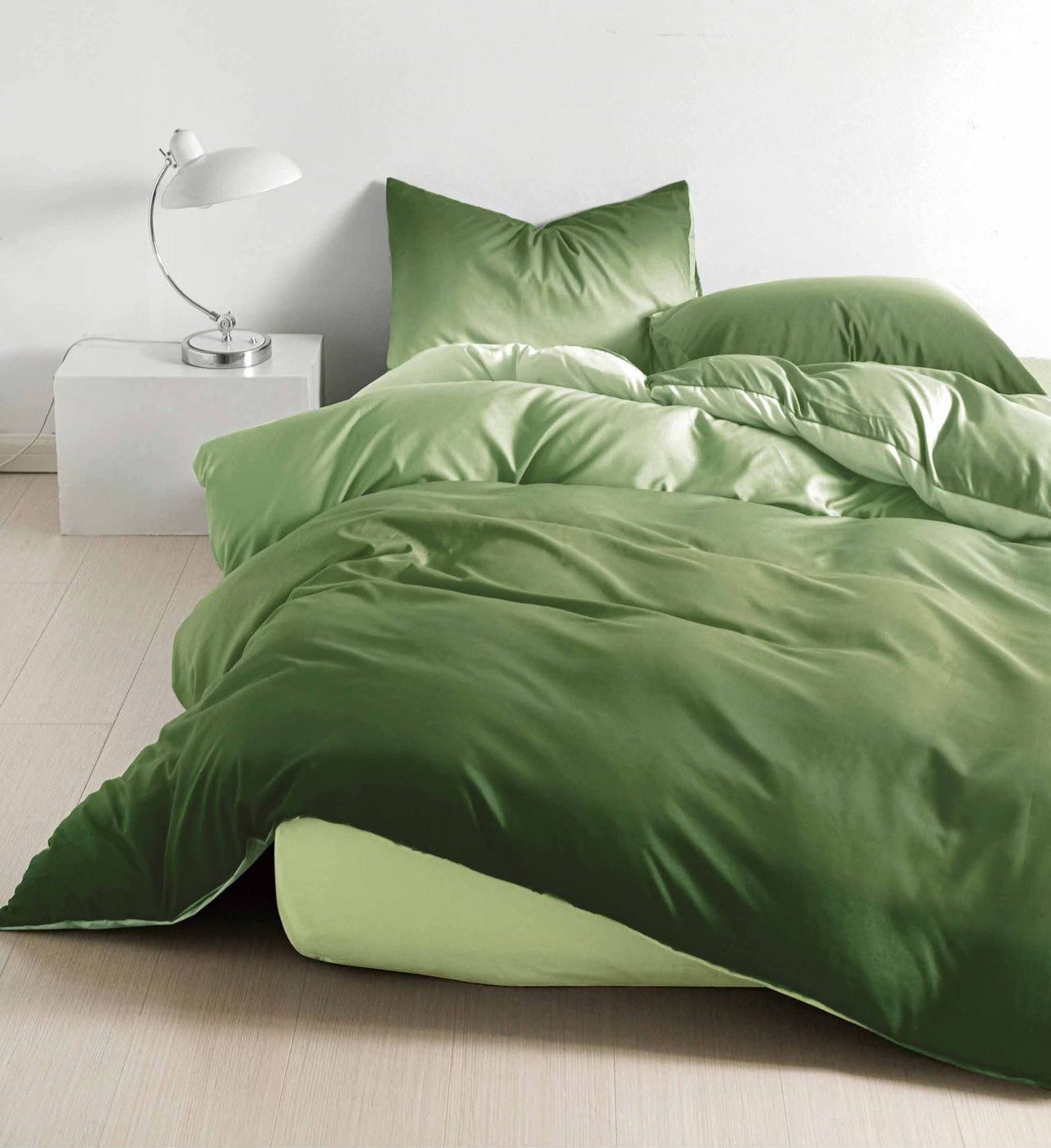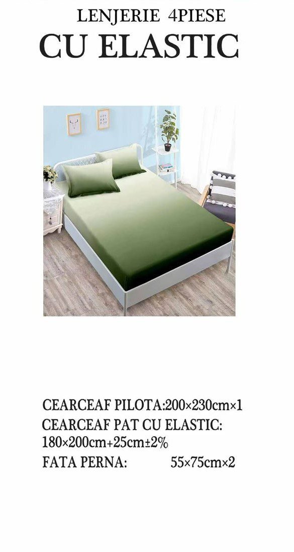 Lenjerie Bumbac Satinat, Cearceaf cu Elastic, 4 Piese, cu 2 fețe, Pat Dublu, Verde