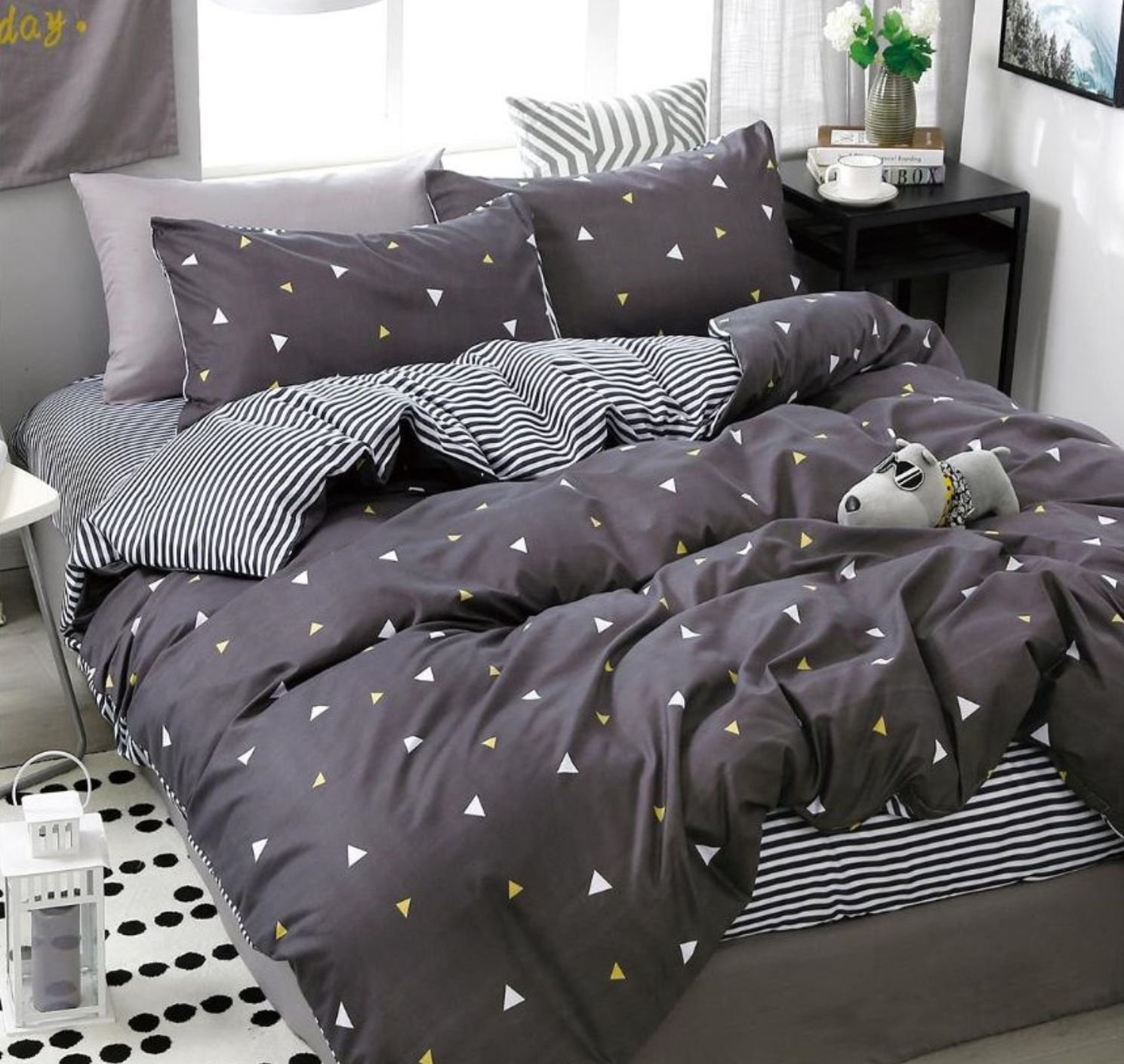 Lenjerie Bumbac Satinat, Cearceaf cu Elastic, 4 Piese, cu 2 fețe, Pat Dublu, Gri, Triunghiuri