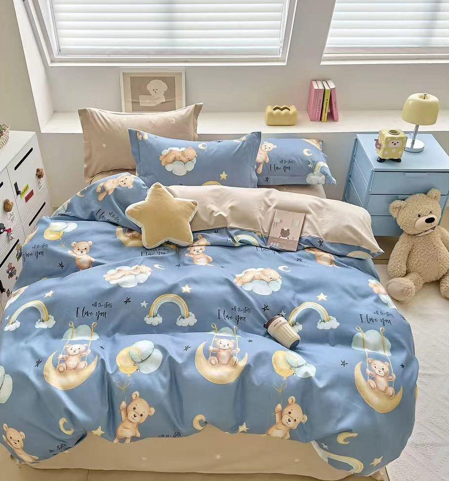 Lenjerie Bumbac Finet, Cearceaf cu Elastic, 6 Piese, Pat Dublu, Clasic, Albastru, All the stars