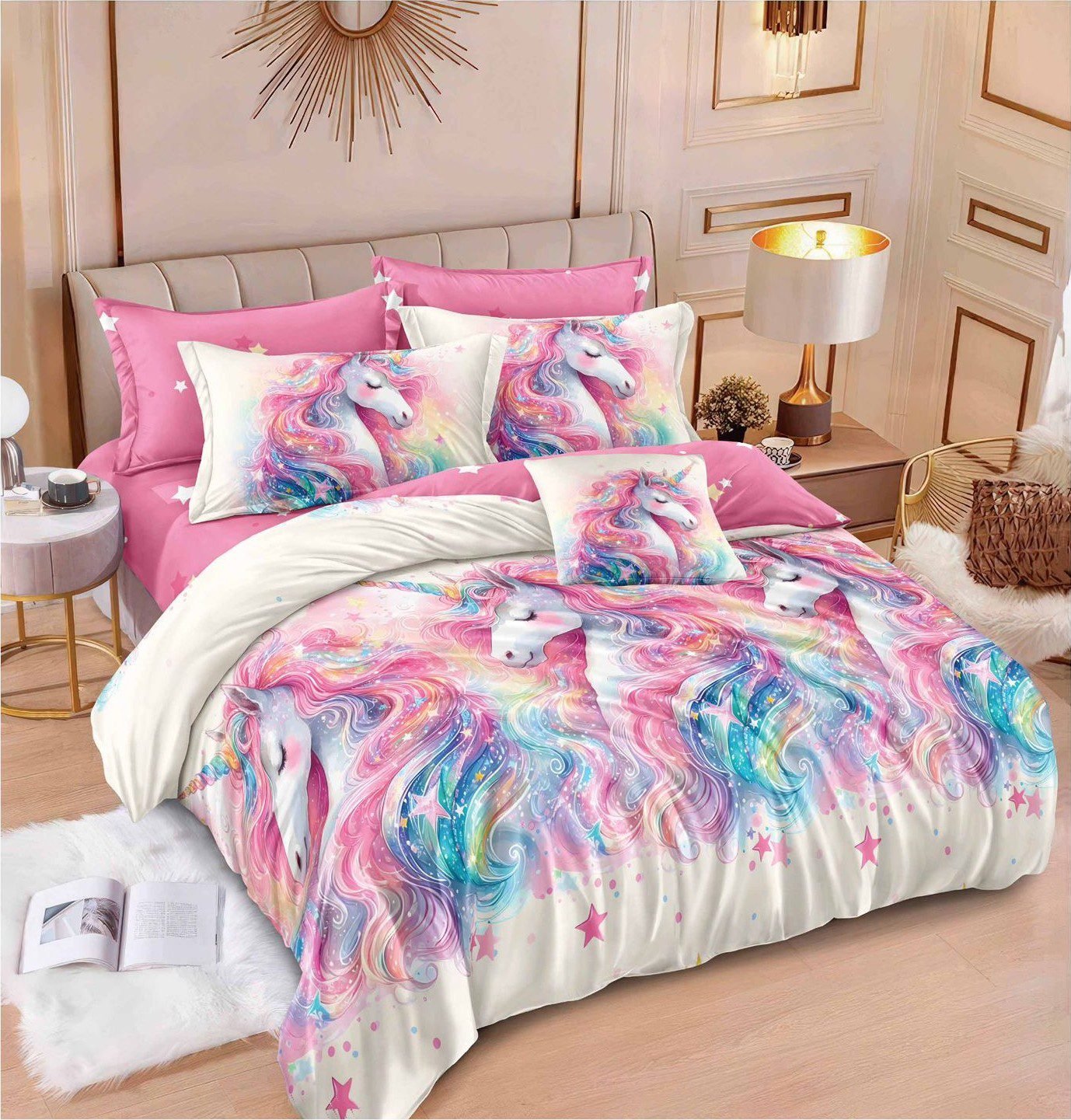 Lenjerie Bumbac Finet, Cearceaf cu Elastic, 6 Piese, Pat Dublu, Clasic, Roz, Unicorni