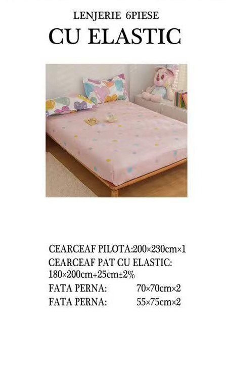 Set Lenjerie cu 6 piese confecționată din Bumbac Finet pentru pat dublu și 4 fețe de pernă.
