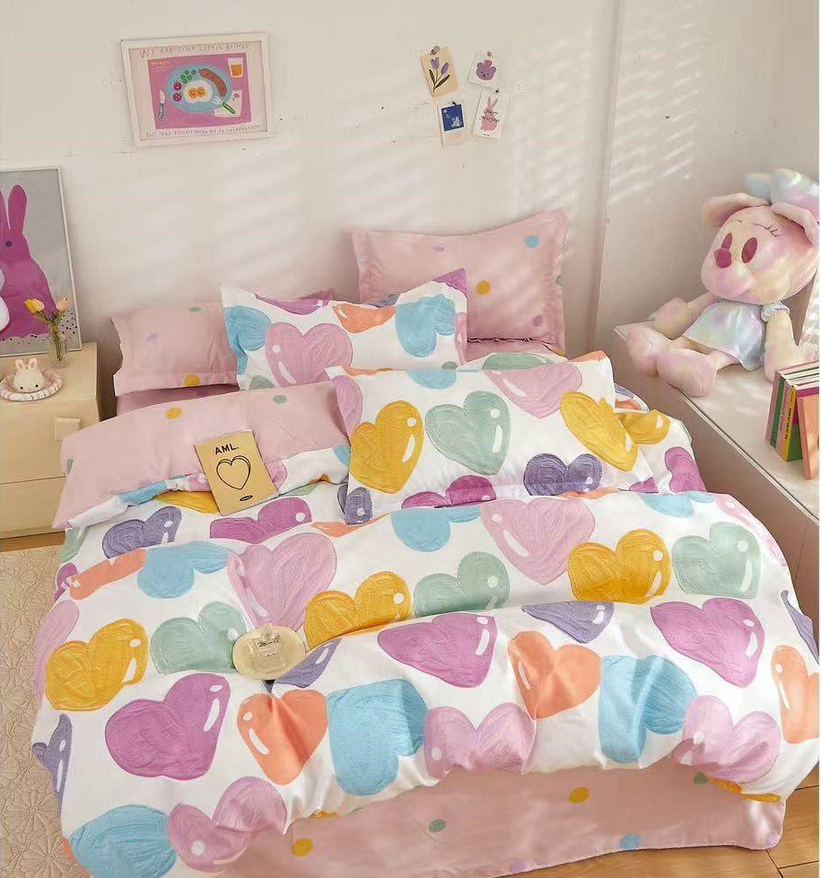 Lenjerie Bumbac Finet, Cearceaf cu Elastic, 6 Piese, Pat Dublu, Clasic, Roz, Alb, Inimioare Colorate