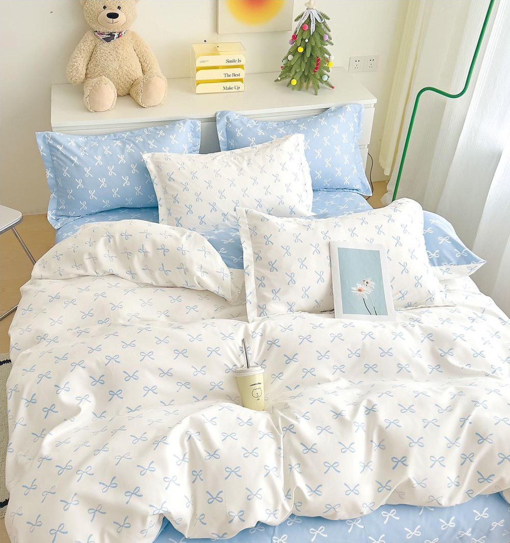 Lenjerie Bumbac Finet, Cearceaf cu Elastic, 6 Piese, Pat Dublu, Clasic, Alb, Bleu, Fundițe