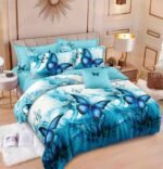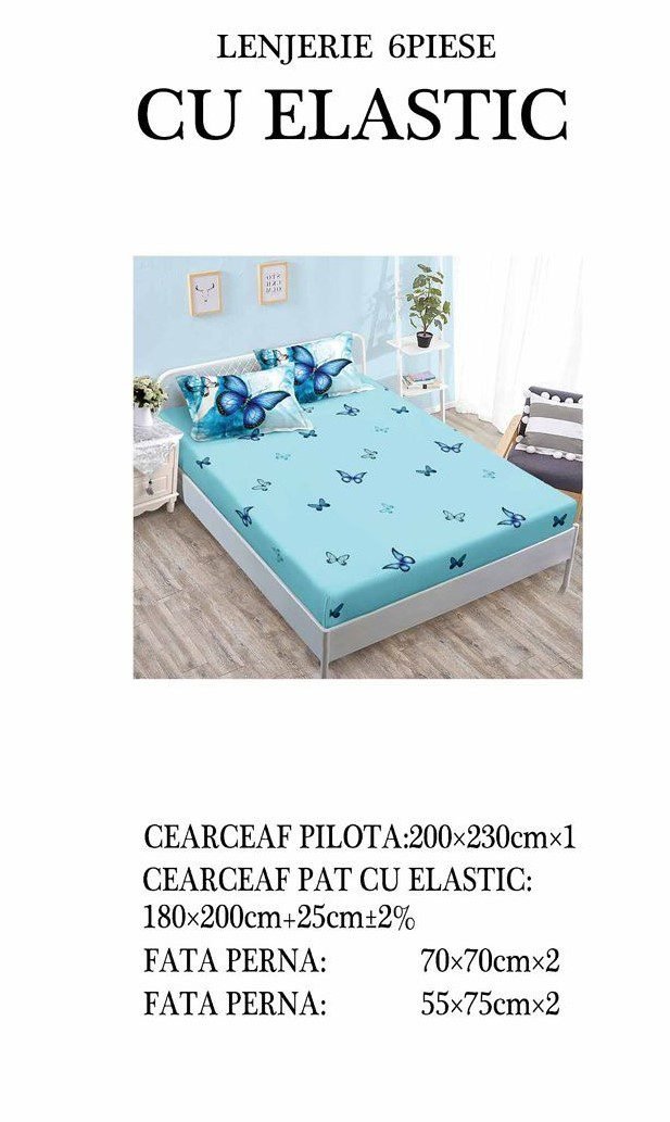 Lenjerie Bumbac Finet, Cearceaf cu Elastic, 6 Piese, Pat Dublu, Clasic, Bleu, Fluturi
