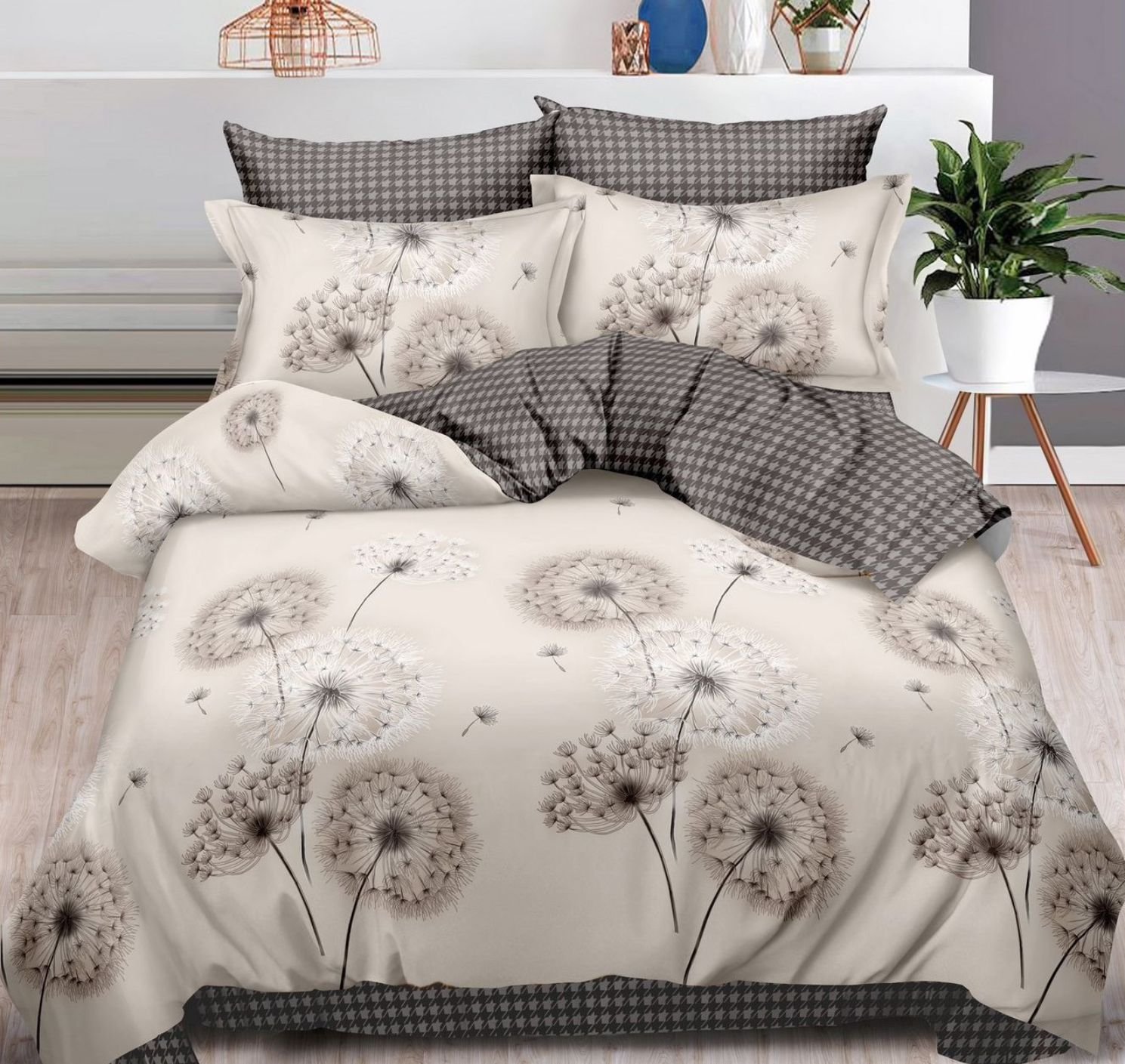 Lenjerie Bumbac Finet, Cearceaf cu Elastic, 6 Piese, Pat Dublu, Clasic, Gri, Păpădie