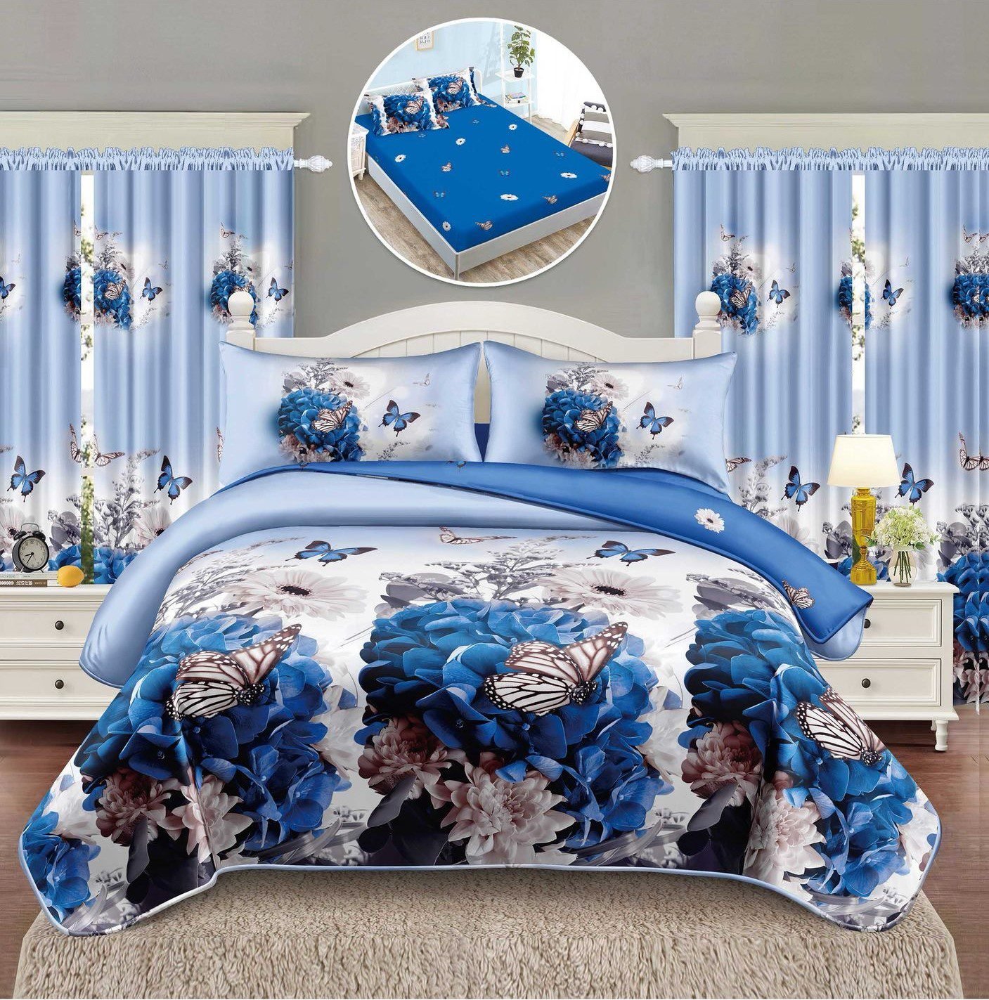 Lenjerie Bumbac Finet, Cearceaf cu Elastic, Pat 1 Persoană, 2 Draperii Incluse, Albastru