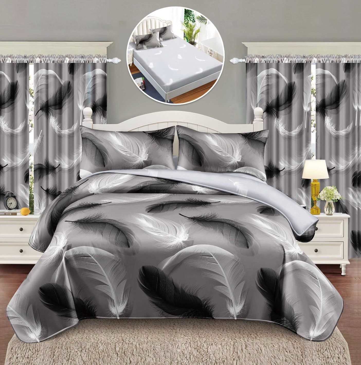 Lenjerie Bumbac Finet, Cearceaf cu Elastic, Pat 1 Persoană, 2 Draperii Incluse, Gri, Pene