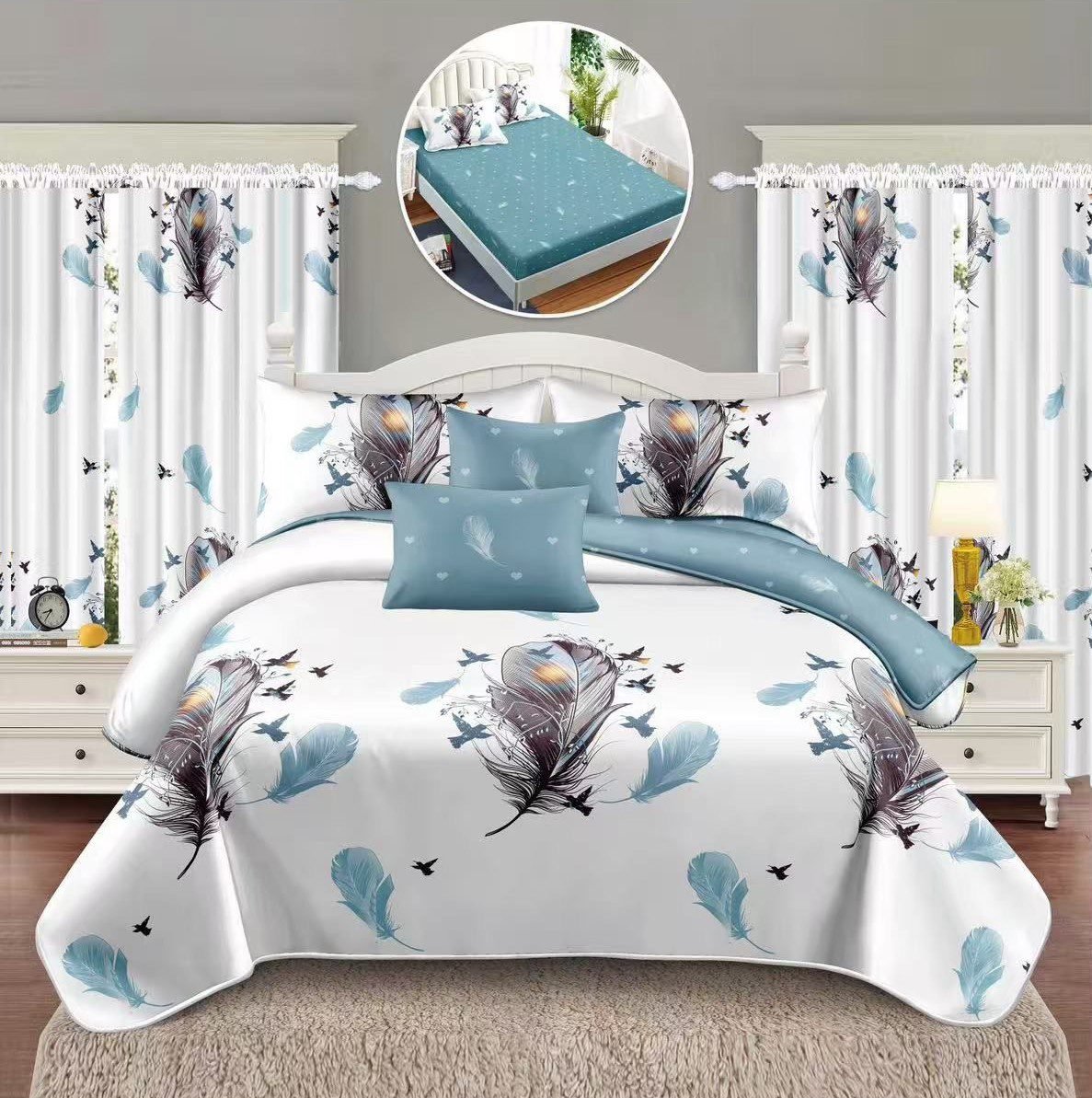 Lenjerie Bumbac Finet, Cearceaf cu Elastic, Pat Dublu, 8 Piese, 2 Draperii Incluse, Alb, Bleu, Pene