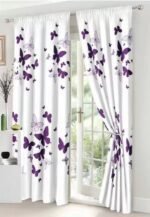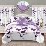 Lenjerie Bumbac Finet, Cearceaf cu Elastic, Pat Dublu, 8 Piese, 2 Draperii Incluse, Alb, Mov, Fluturi