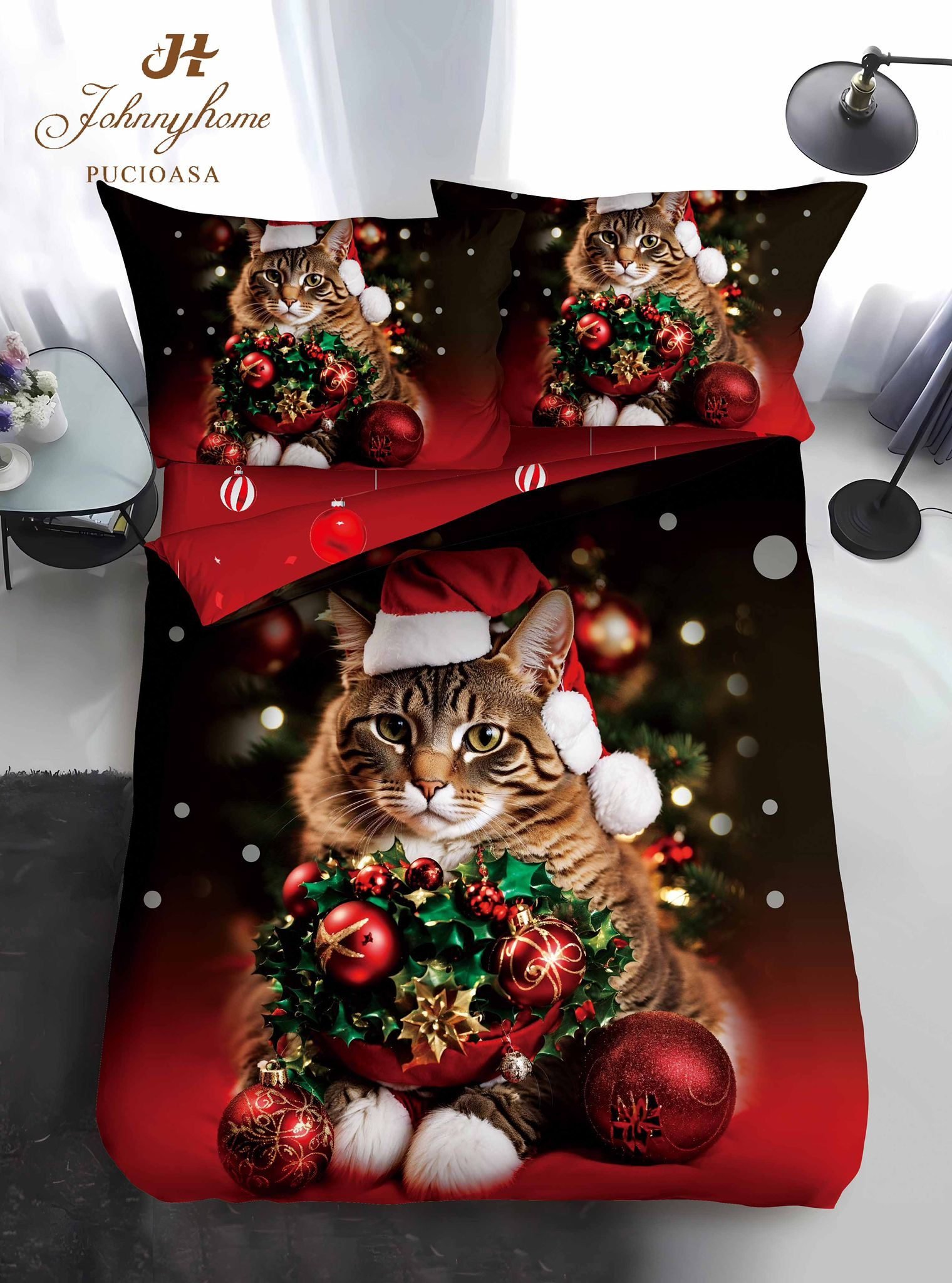 Lenjerie Bumbac Finet, Colecția de Crăciun, 4 Piese, Pat 1 Persoană, Pisicuța cu Dor de Sărbători