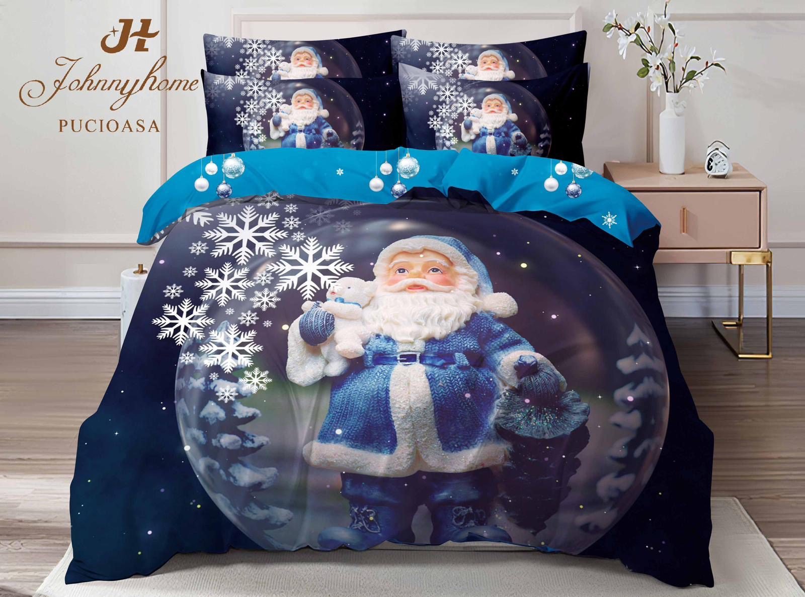 Lenjerie Bumbac Finet, Colecția de Crăciun, 6 Piese, Pat Dublu, Moșul Albastru și Globul Fermecat