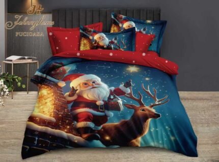 Lenjerie Bumbac Finet, Colecția de Crăciun, 6 Piese, Pat Dublu, Moșul Zboară cu Bucurie