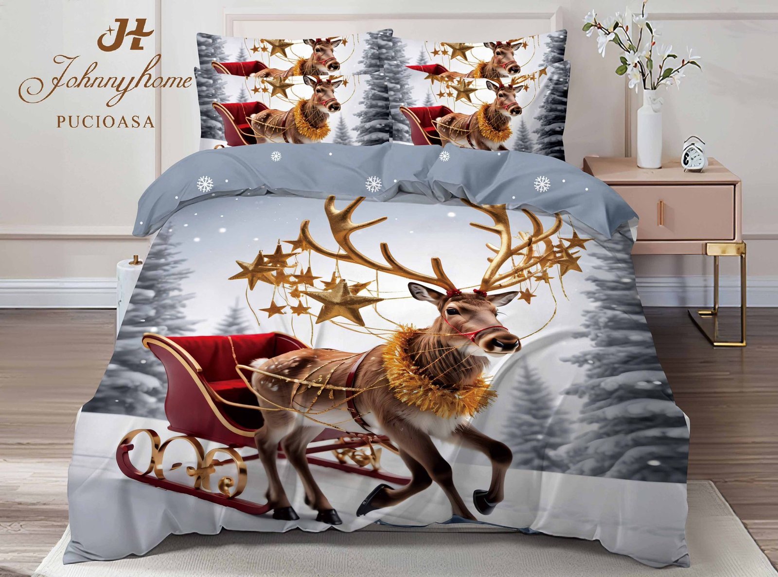 Lenjerie Bumbac Finet, Colecția de Crăciun, 6 Piese, Pat Dublu, Sania Moșului în Pădurea Fermecată
