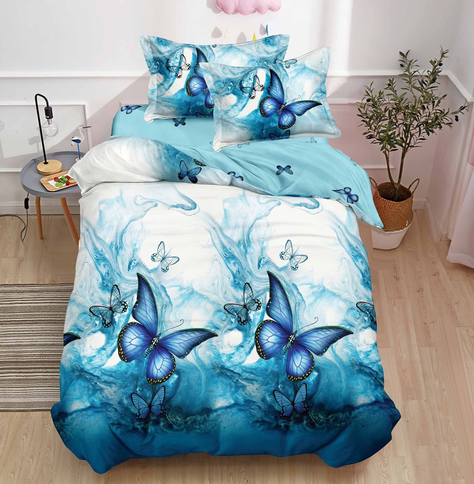Lenjerie Bumbac Finet, cu Elastic, 4 Piese, Pat 1 Persoană, Albastru, Fluturi