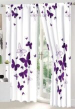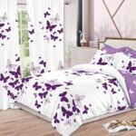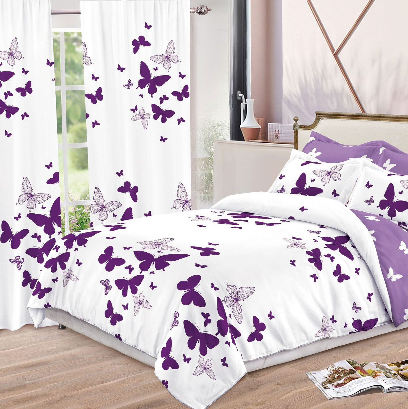 Lenjerie Bumbac Finet, Pat Dublu, 8 Piese, 2 Draperii Incluse, Alb, Mov, Fluturi